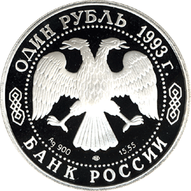 Аверс: в центре диска - эмблема Банка России (двуглавый орёл художника И. Билибина), под ним: слева - обозначение металла, проба сплава, в центре - товарный знак монетного двора, справа - содержание драгоценного металла в чистоте По окружности надписи, обрамлённые кругом из точек: вверху - "ОДИН РУБЛЬ 1993 г.", внизу - "БАНК РОССИИ".